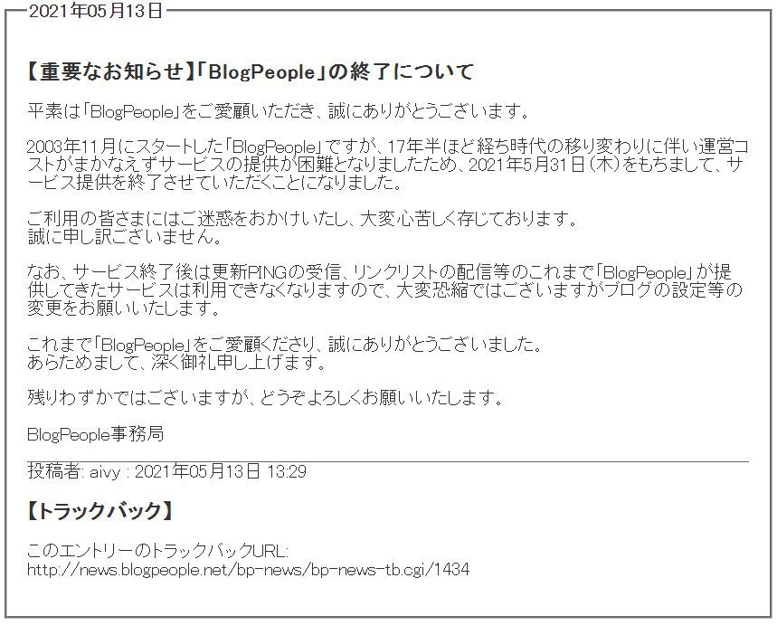 BlogPeopleのサービスは、本日をもって終了するようです。
