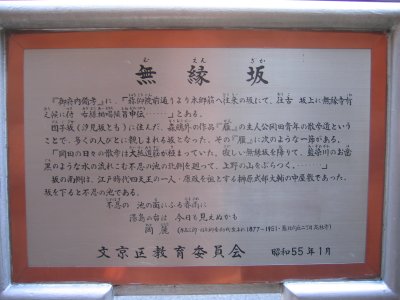 無縁坂は、東京都台東区池之端1丁目から文京区湯島4丁目へ登る坂で、森鴎外の作品「雁」の主人公である岡田青年の散歩道とぃうことで、多くの人びとに親しまれる坂となりました。「雁」の中には、次のようなー節があります。